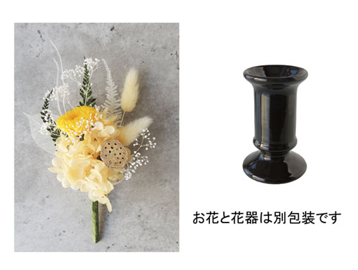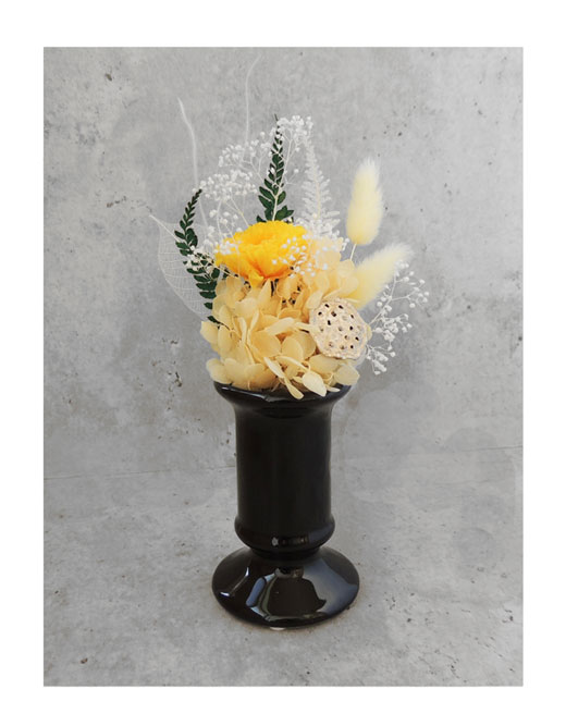 仏花・アレンジメント(お供え花)ヒチリキ・ブラック(山吹)■美しいプリザーブドフラワーアレンジメント仏花■小さなアレンジメント仏花 お手入れは不要■お花と花器のセット(別包装) ■花材が変更になる場合がございます■お花の茎を折り曲げたり、詰め物で高さを調整して花器にセットしてください