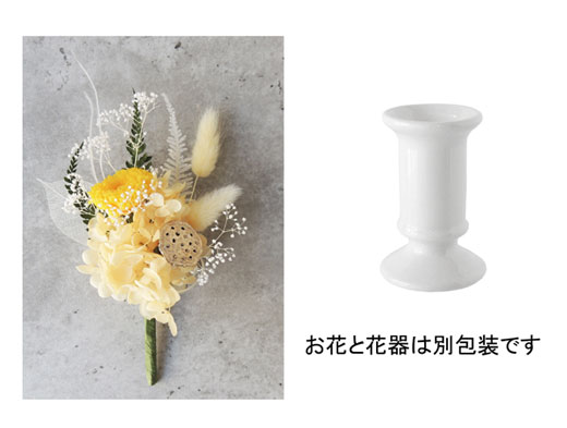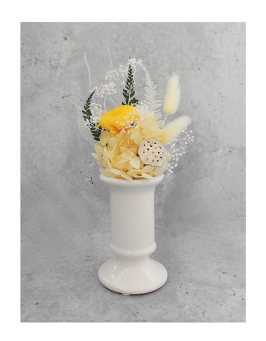仏花・アレンジメント(お供え花)ヒチリキ・ホワイト(山吹)■美しいプリザーブドフラワーアレンジメント仏花■小さなアレンジメント仏花 お手入れは不要■お花と花器のセット(別包装) ■花材が変更になる場合がございます■お花の茎を折り曲げたり、詰め物で高さを調整して花器にセットしてください