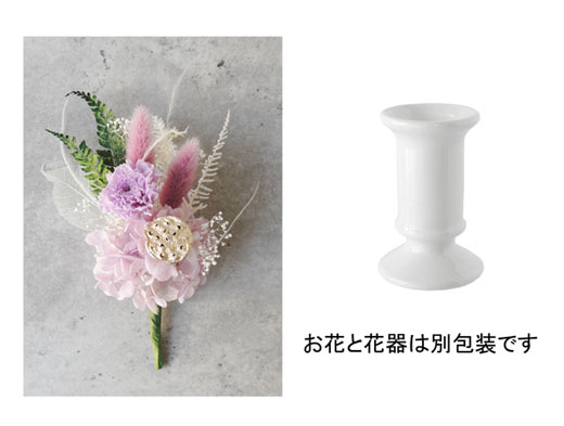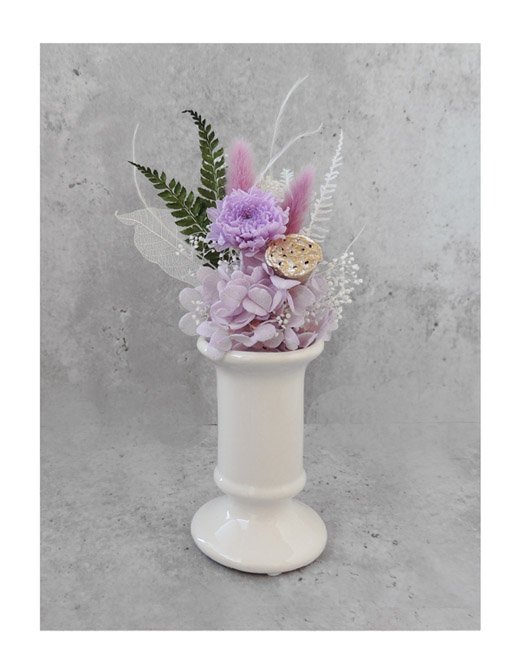 仏花・アレンジメント(お供え花)ヒチリキ・ホワイト(藤色)■美しいプリザーブドフラワーアレンジメント仏花■小さなアレンジメント仏花 お手入れは不要■お花と花器のセット(別包装) ■花材が変更になる場合がございます■お花の茎を折り曲げたり、詰め物で高さを調整して花器にセットしてください