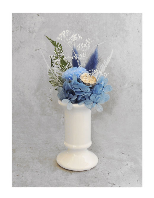 仏花・アレンジメント(お供え花)ヒチリキ・ホワイト(瑠璃)■美しいプリザーブドフラワーアレンジメント仏花■小さなアレンジメント仏花 お手入れは不要■お花と花器のセット(別包装) ■花材が変更になる場合がございます■お花の茎を折り曲げたり、詰め物で高さを調整して花器にセットしてください
